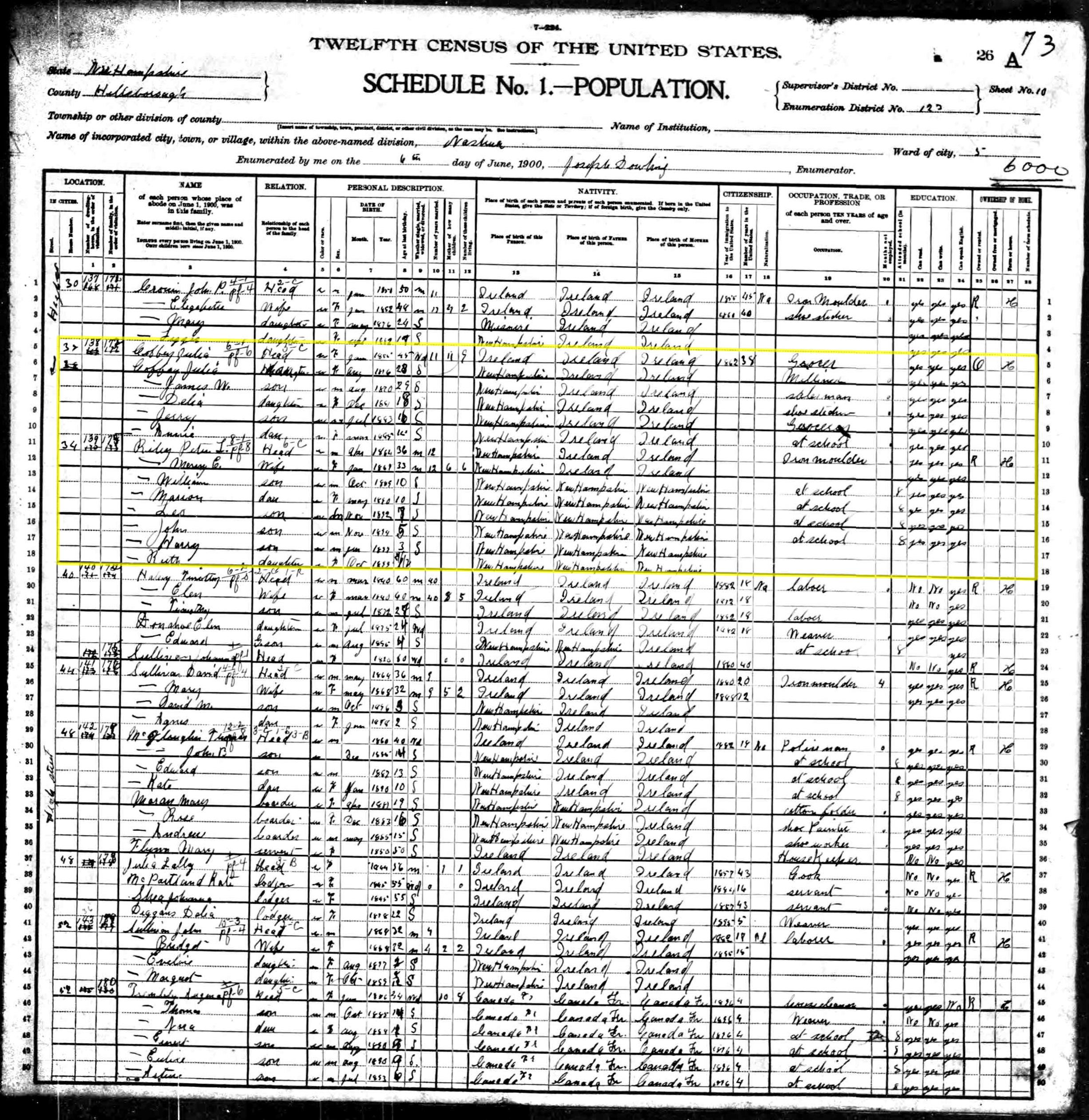 Julia (Shea) Coffey Family & Mary Coffey and Peter Riley Family1900 U.S. Census: New Hampshire - Hillsborough - Nashua - Ward 5 - District 123 (See full size >>)Peter and Mary lived next door to Mary's mother Julia and Mary's younger siblings. |