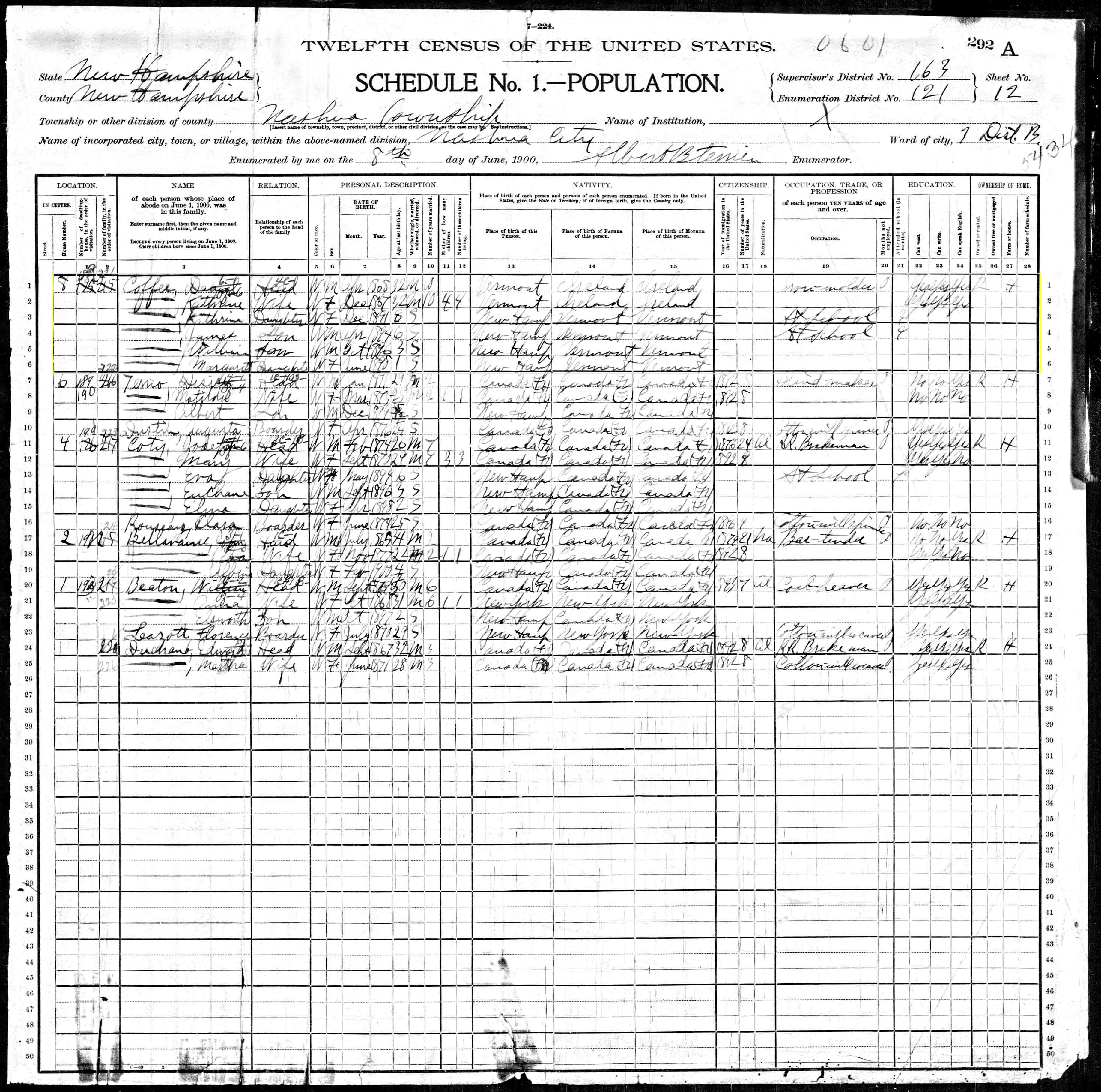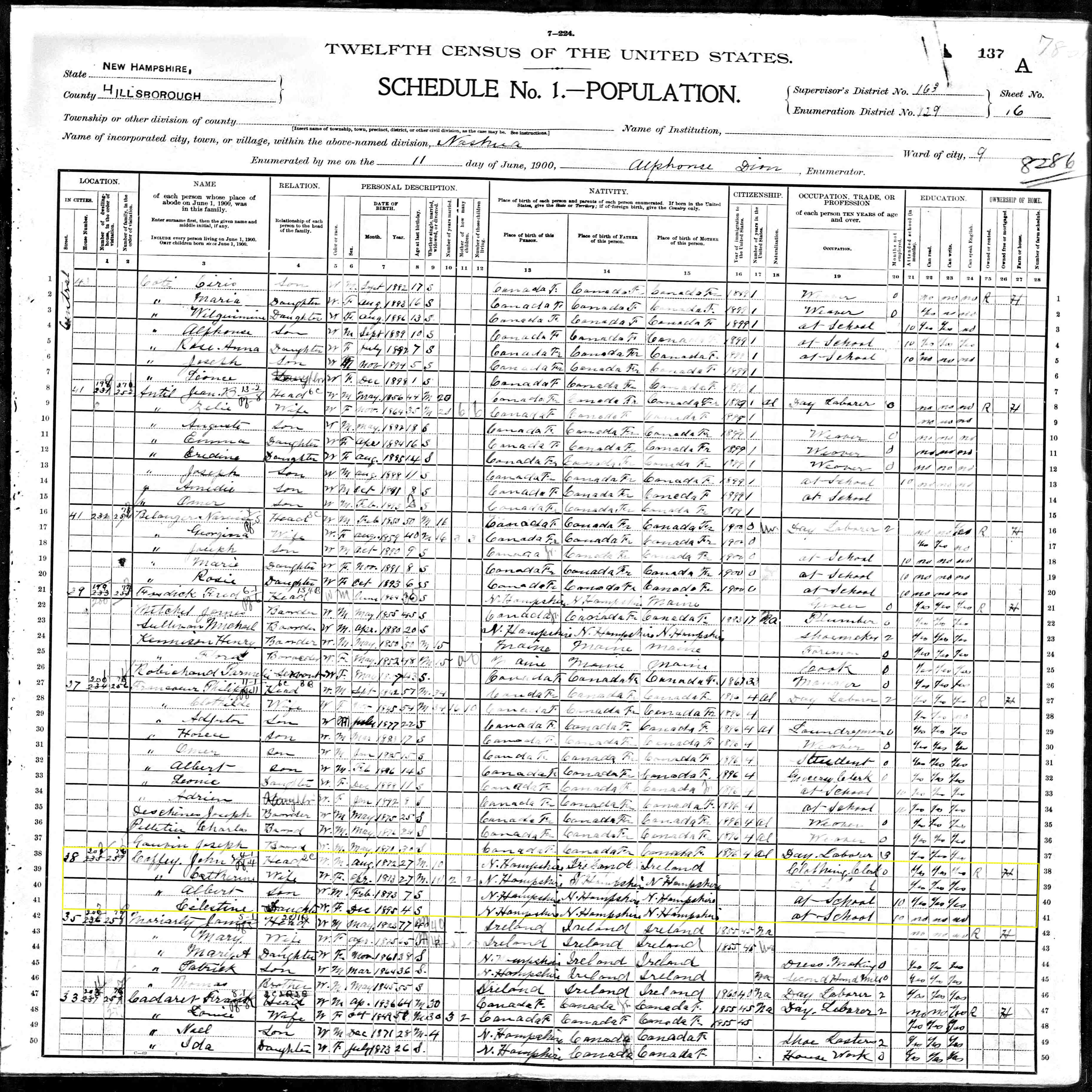 John Coffey familyJohn W. Coffey - Julia (Shea) Coffey's third son; Mary Elizabeth's brother.1900 U.S. Census: New Hampshire - Hillsborough - Nashua - Ward 9 - District 129 (See full size >>) Address: 38 Central St., Nashua NH |