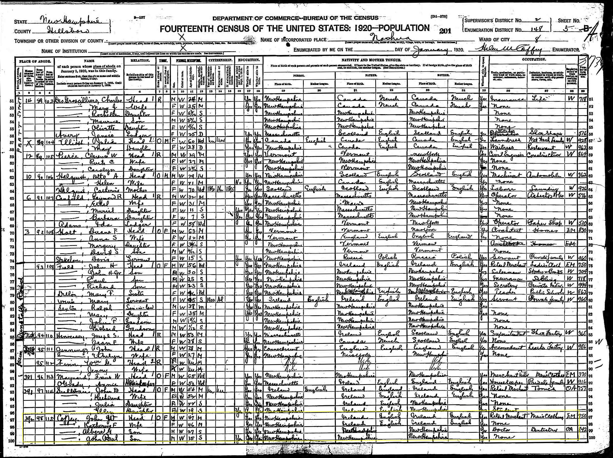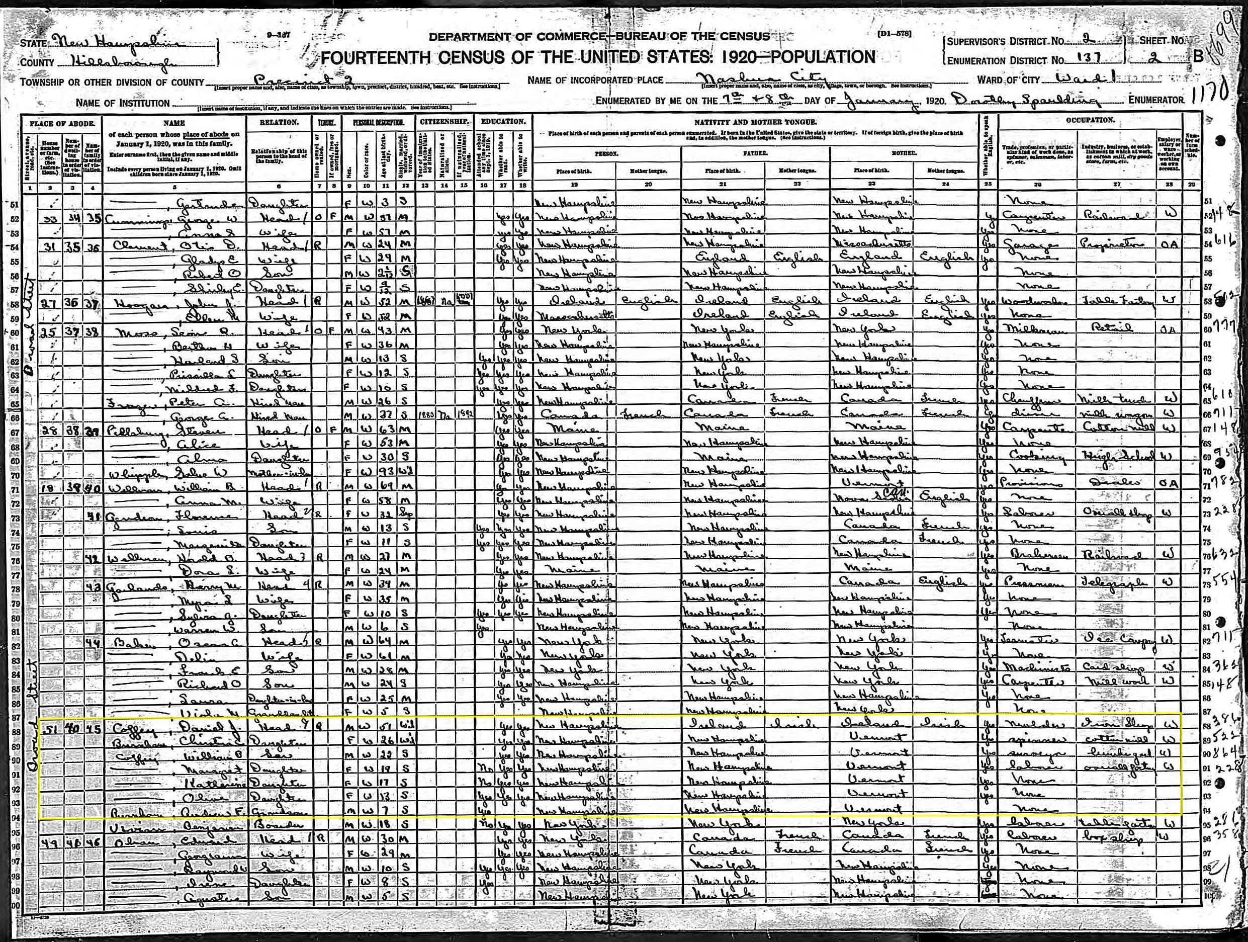 John Coffey Family1920 U.S. Census: New Hampshire - Hillsborough - Nashua - Ward 8 - District 148 (See full size >>)Address: 392 Main St., Nashua NH |