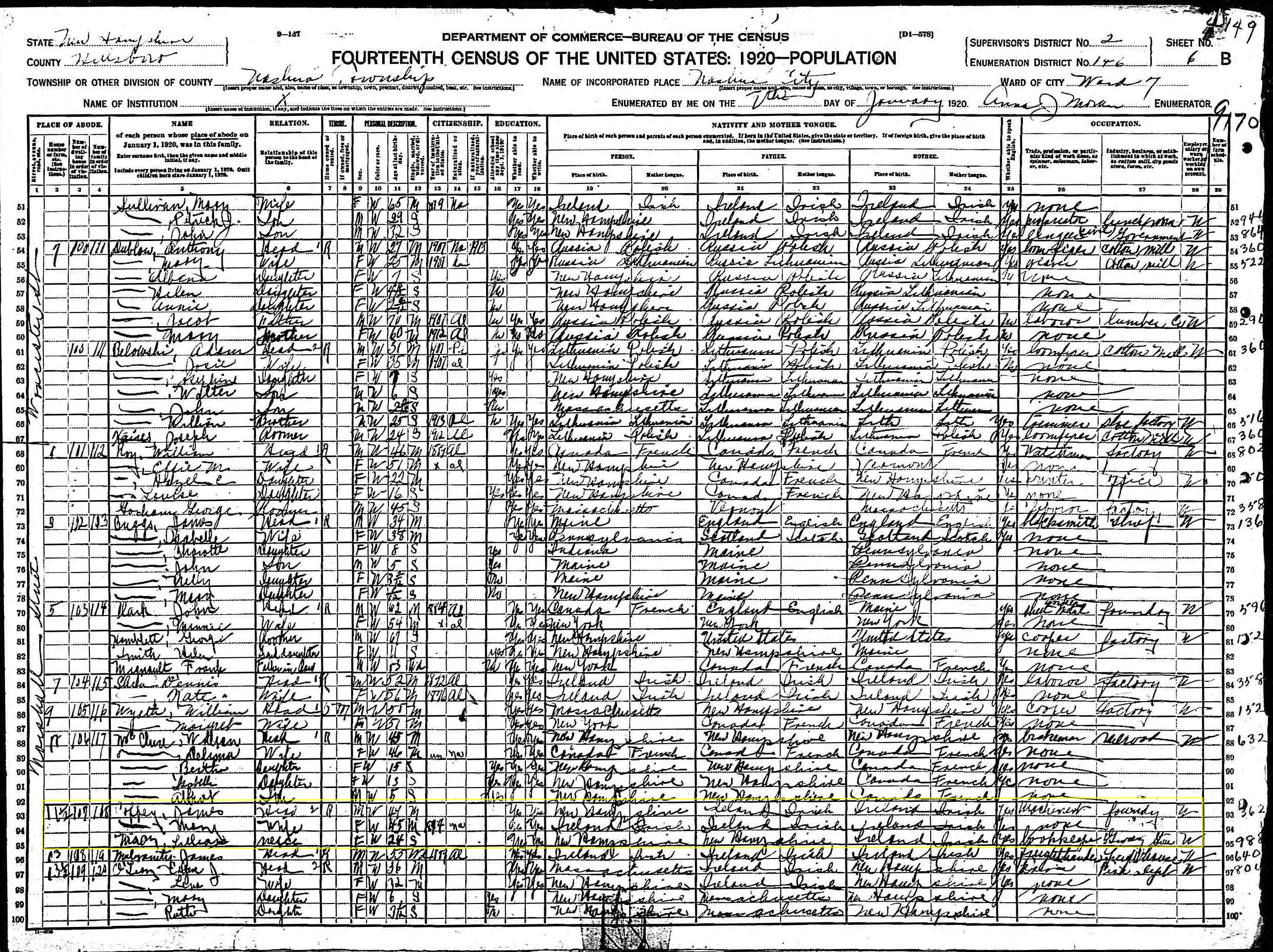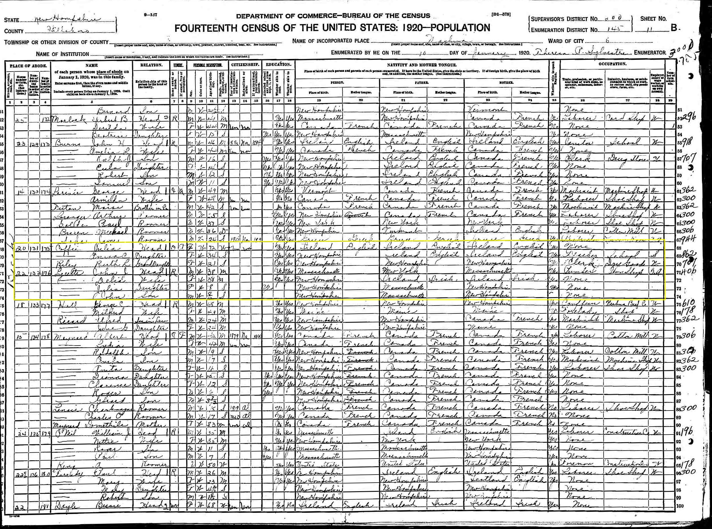 Julia (Shea) Coffey and Delia (Coffey) Lycette Families1920 U.S. Census: New Hampshire - Hillsborough - Nashua - Ward 6 - District 145 (See full size >>)Address: 20 and 22 Beech St., Nashua NH |
