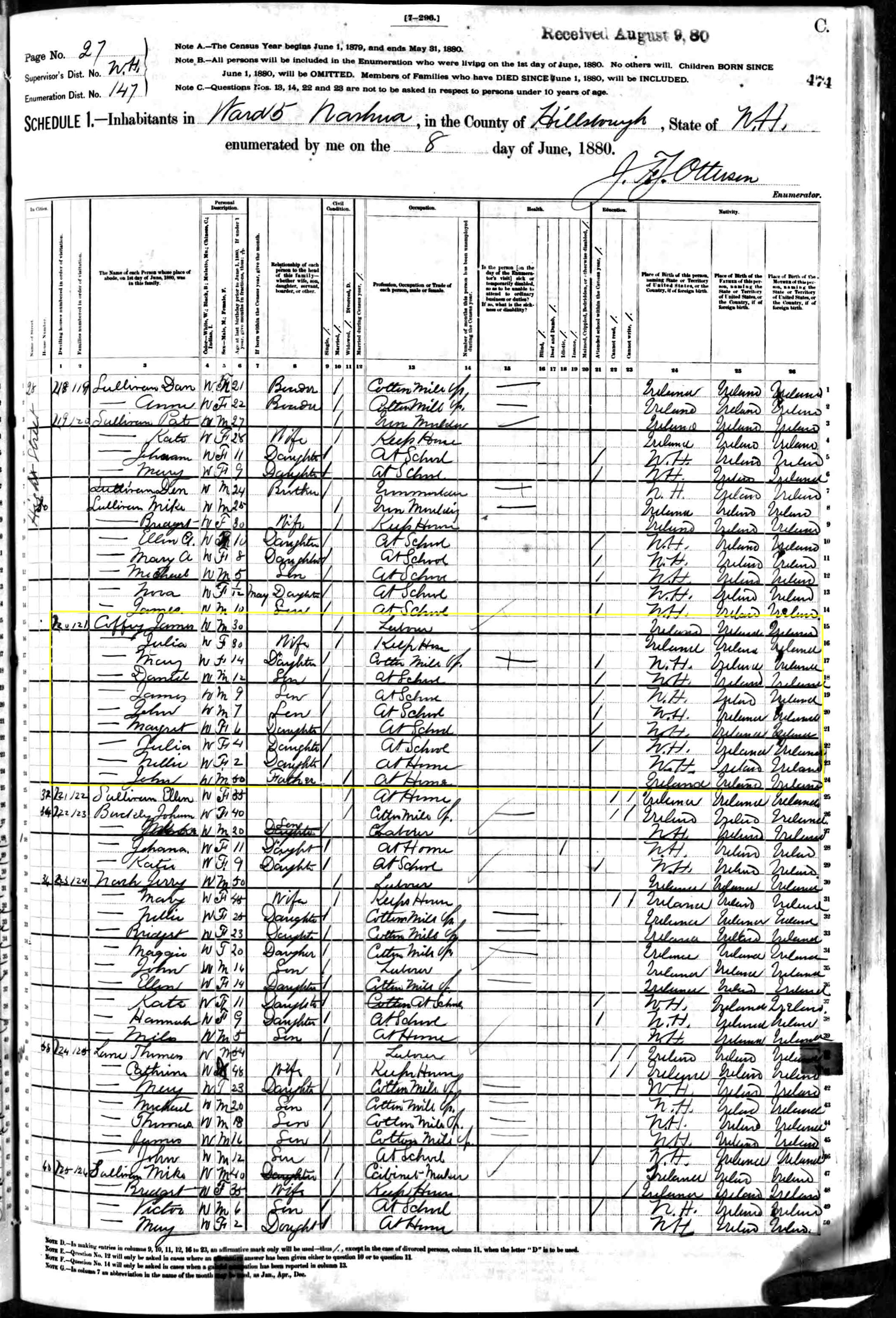 1880 U.S. Census: New Hampshire - Hillsborough - Nashua - Ward 5 - District 147 (See full size >>)Address: 29 or 30 (?) High St., Nashua, NH