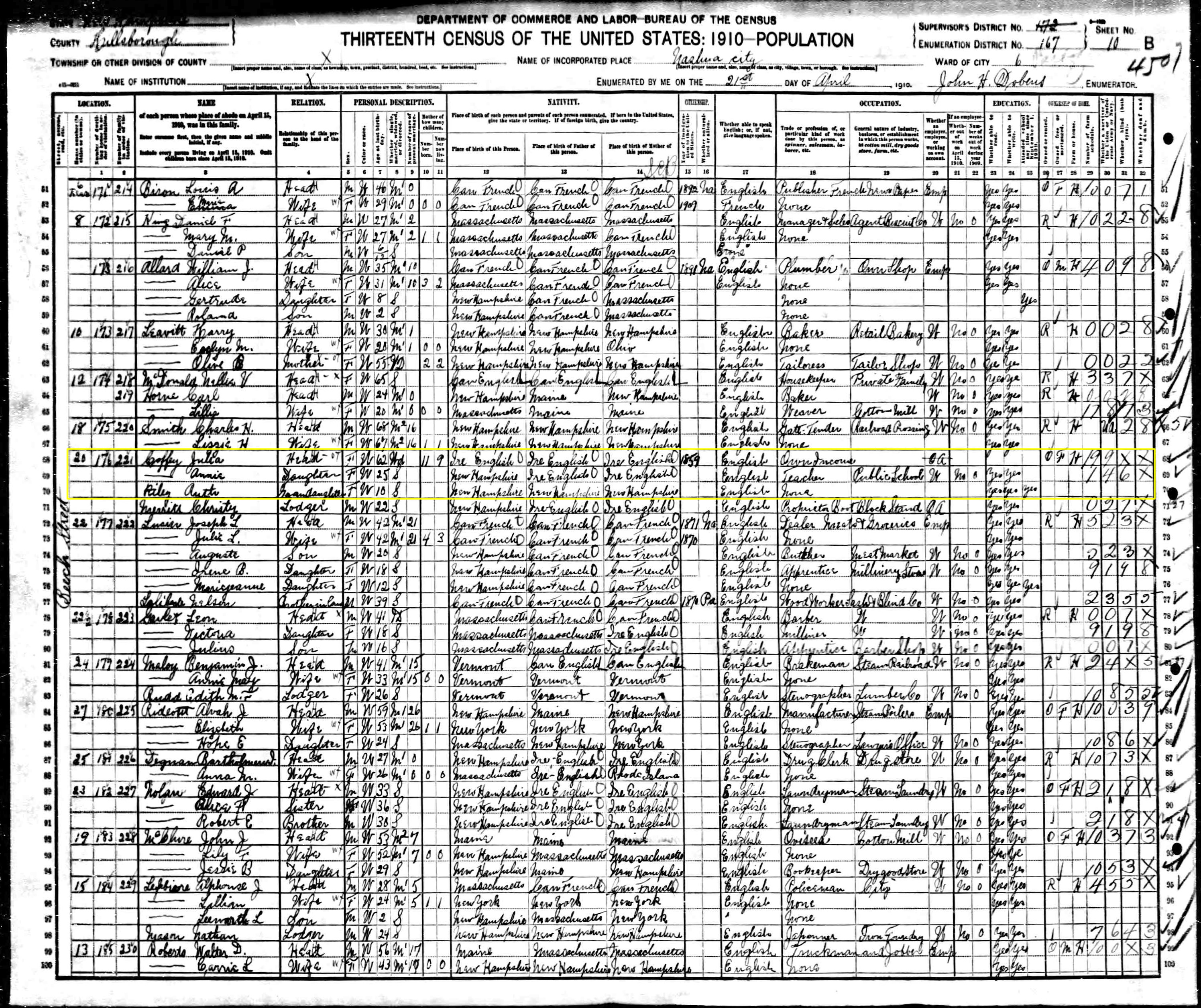 Julia (Shea) Coffey Family1910 U.S. Census: New Hampshire - Hillsborough - Nashua - Ward 6 - District 167 (See full size >>)Address: 20 Beech St., Nashua NH |