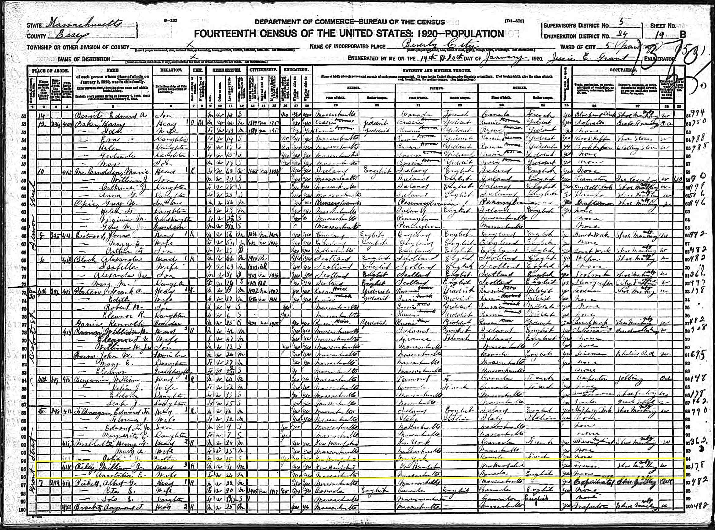 William Riley and Anastasia Cheverie Family1920 U.S. Census: Massachusetts - Essex - Beverly (See full size >>)Address: 5 Grant St., Beverly MA |