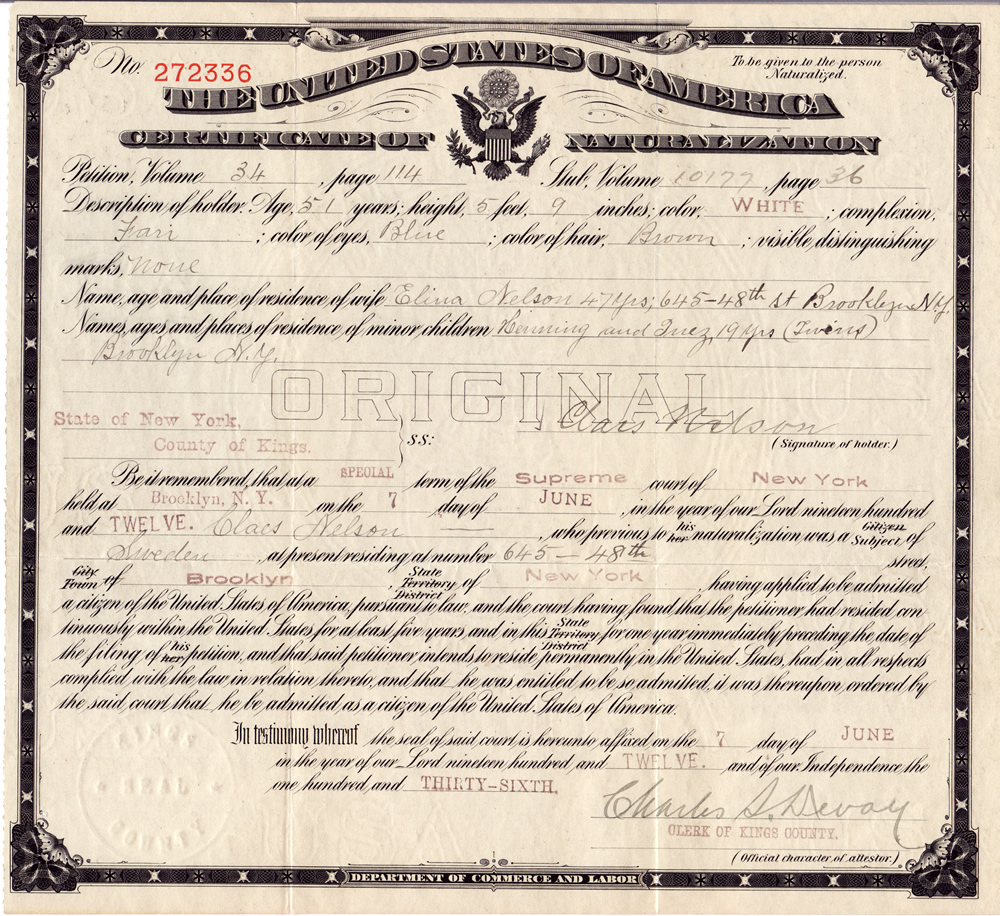 - Husband Eric A. A. Nelson, born in Sweden on Dec. 12, emigrated to the U.S. Oct. 9, 1903, naturalized as a citizen in Brooklyn N.Y. on April 29, 1913