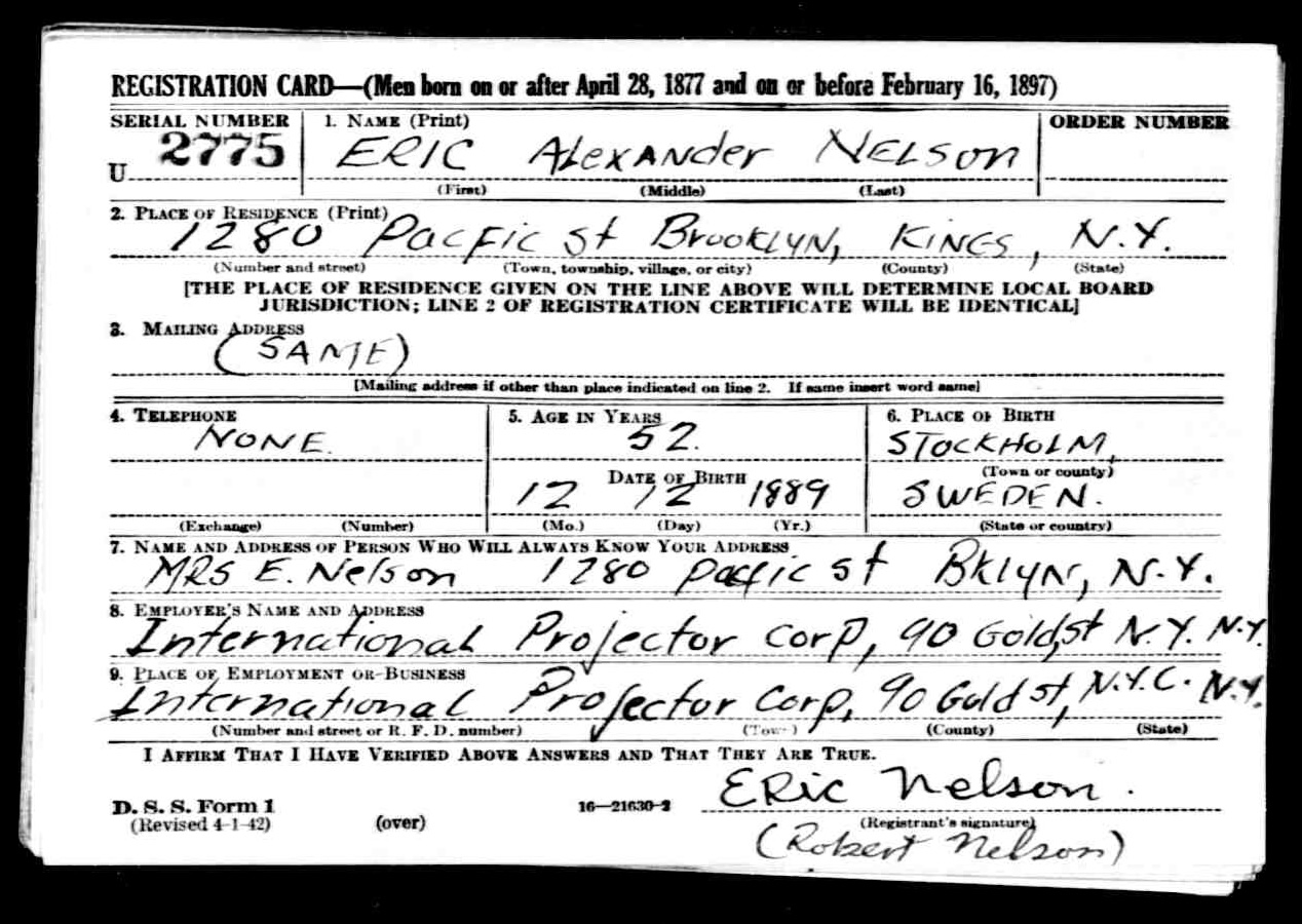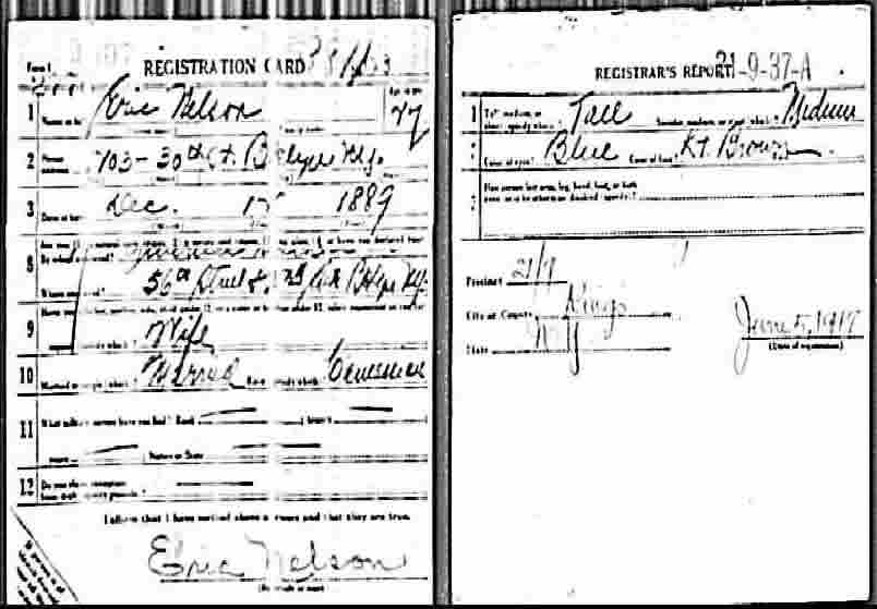 Eric Nelson filled out his military draft registration card for World War I on June 5, 1917. He registered in Kings County, NY. His address was 103 30th St. Brooklyn NY. Date of birth: Dec. 12 1889. He was described as tall, of medium build, blue eyes and brown hair.