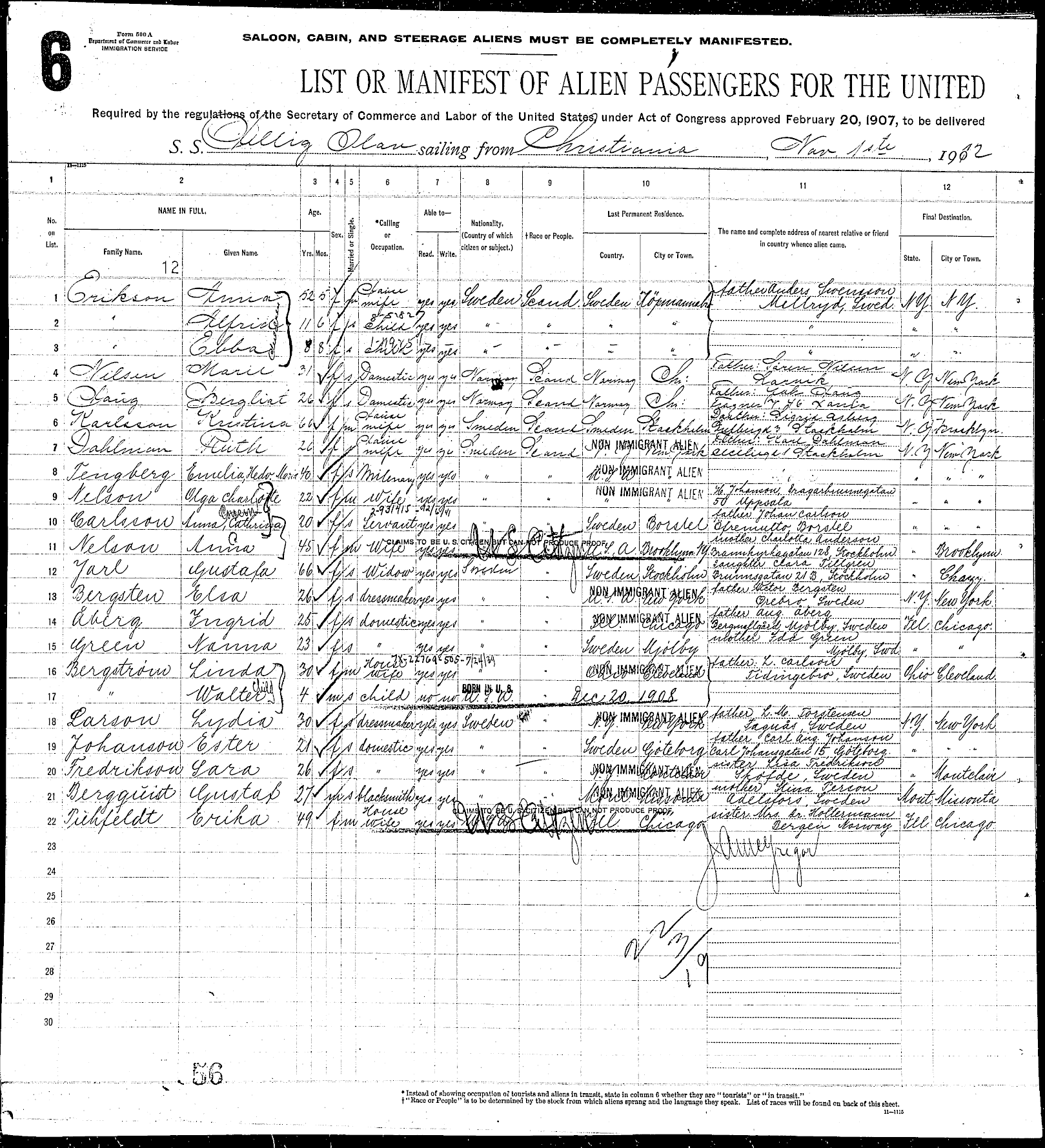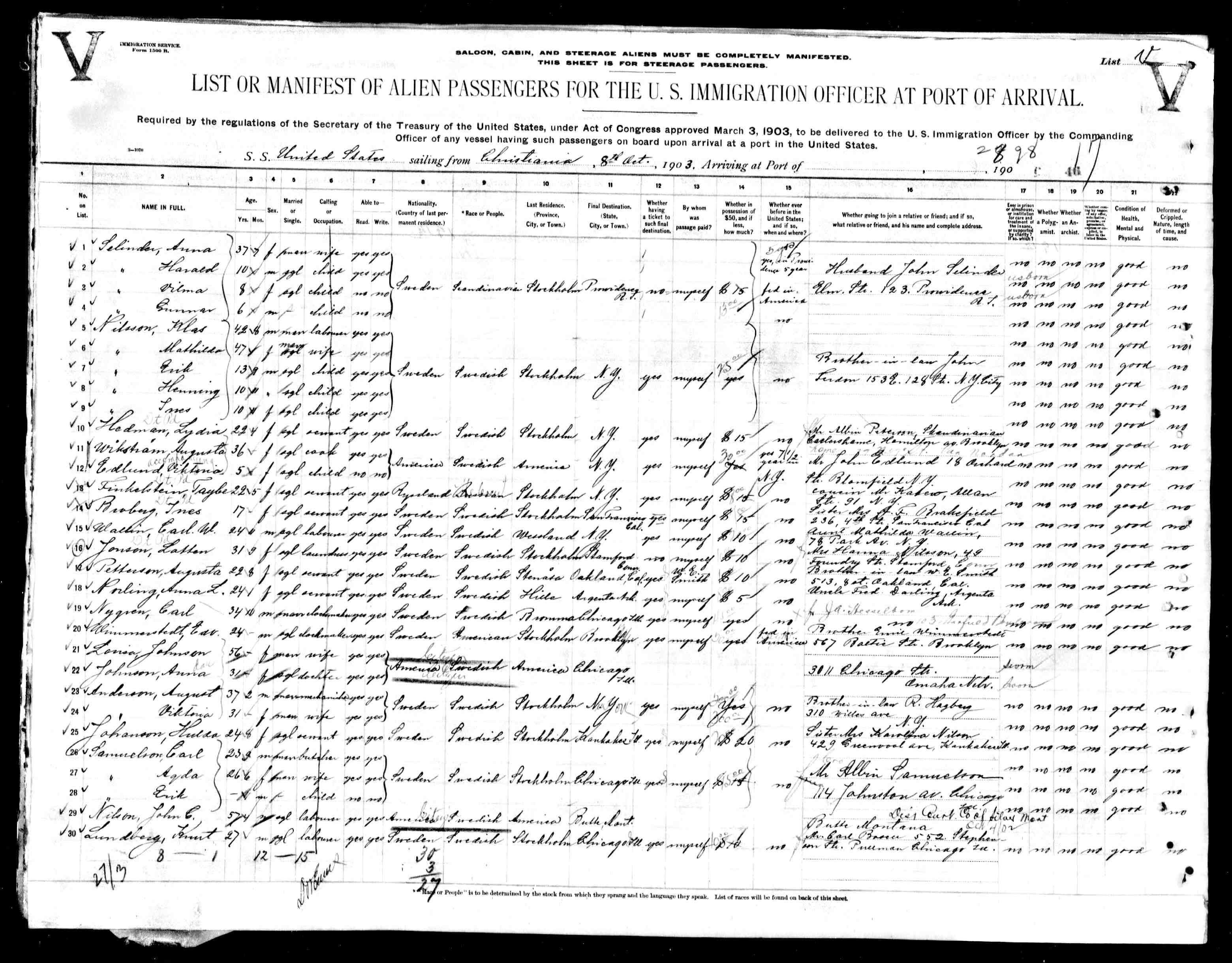 The Nilsson family arrived in New York from Stockholm, Sweden on October 19, 1903. The passenger list for their ship, the SS United States reads: