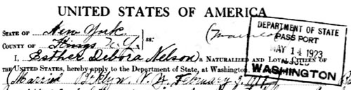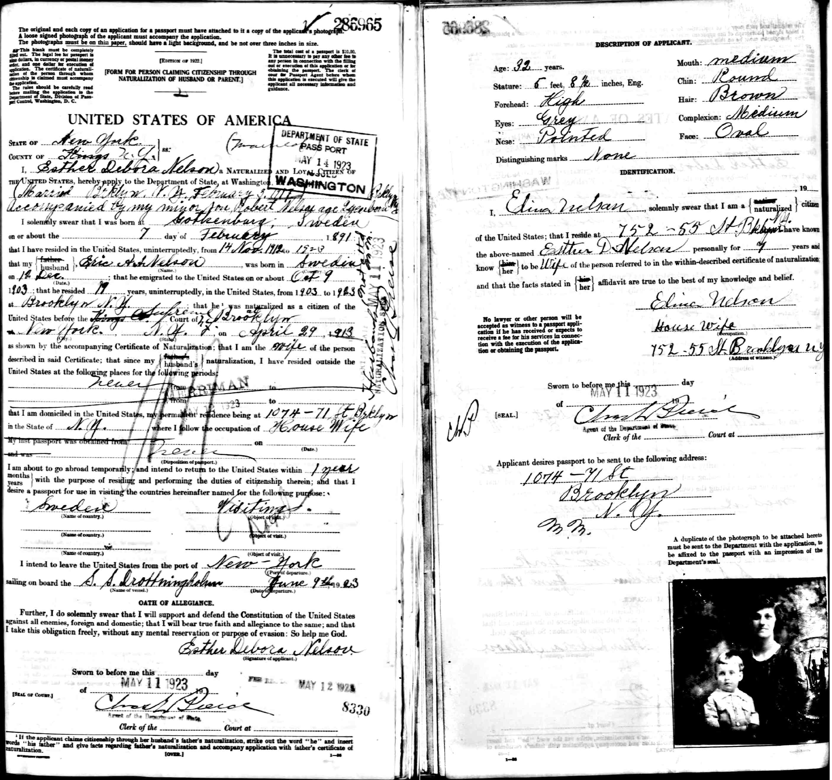 Esther Nelson applied for a passport on May 11, 1923 (see application), in preparation for her and her 2-year-old son Robert to take a trip to Sweden. The passport application includes a photo of her and Robert (above right) although the scanned image is of poor quality. Esther's passport application reads: